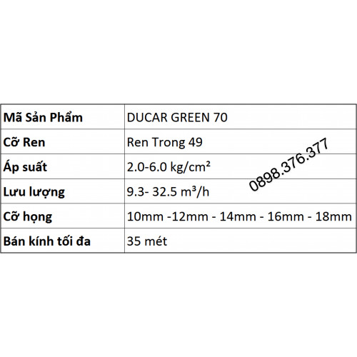 Béc DUCAR GREEN 70 bắn xa tối đa 35 mét với lưu lượng đạt tới 32 m3/h. có thể tưới một lần gần 4 sào nam bộ (4000 m2) rất thích hợp cho tưới cây công nghiệp như cây cà phê, cây hồ tiêu, cây chè.